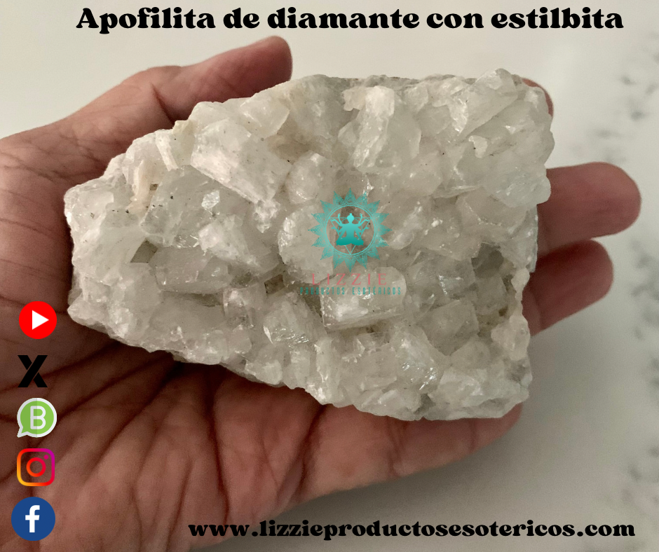La apofilita en cristaloterapia es conocida como una piedra de conexión entre el mundo espiritual y el físico. Le llaman la llave porque se considera que abre la percepción. La apofilita favorece el estado meditativo y potencia la intuición. Es una piedra calmante que ayuda a la introspección y a la liberación de patrones mentales y emociones reprimidas. A nivel curativo se dice que la apofilita favorece el sistema respiratorio. también actúa para ampliar el espacio que le rodea con sus poderosos efectos purificadores y reenergizantes. Grandes trozos de Apofilita colocados en su entorno llenan la habitación con altas vibraciones asociadas a los reinos angélicos de otro mundo.